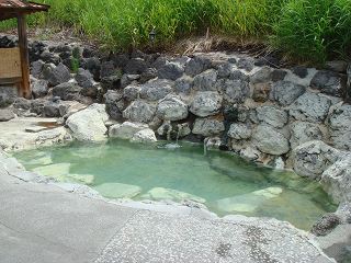 露天風呂は5人が入れる石組みの浴槽で、(周囲を塀に囲まれていないので)開放感は
