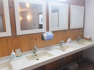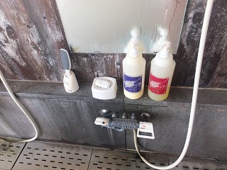 浴室の右側に並ぶカランは 金属部門が温泉の影響で真っ黒になっていて、ソープ類の