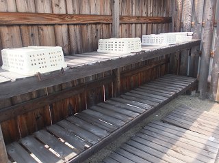 脱衣所は簡素な作りで プラスチックの籠が載った棚があるだけです。