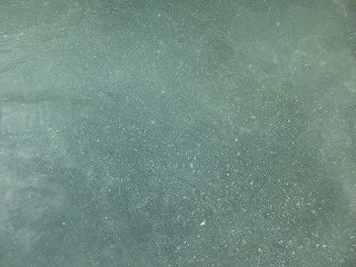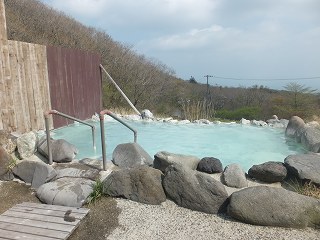 内湯は きめの細かい白濁でしたが 露天の温泉は青みがかっていて、浴槽内を歩くと 床に