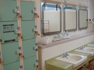 白を基調にした脱衣所には スチール製のロッカーと 棚に乗ったプラスチックの籠があります。