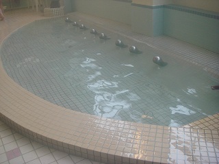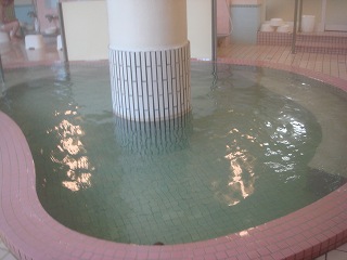 温泉は 左に2つの四角い浴槽、中央に 湾曲した大浴槽、その向かいに 寝湯、一番奥に