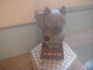 寝湯の横に 千客万来と書かれた かわいい招き猫の石像があります。