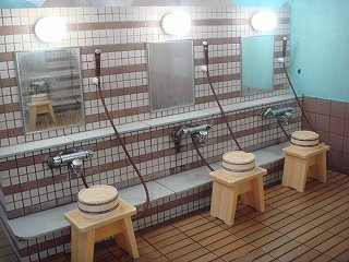 2重扉を開けて浴室に入ると 左に掛け湯があって、その奥に15の洗い場があります。