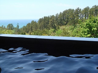 高台にある露天風呂は申し分のないロケーションで、手前の山越しに海が見えました。