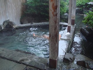 露天風呂は それほど大きくないうえに塀に囲まれているので開放感はありませんが、隣の池を