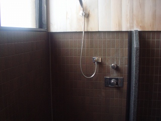 浴室の窓側に並ぶ洗い場は 半分にだけ仕切り板が付いてます。