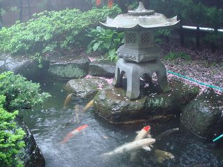 泳ぐ鯉を眺めながら温泉を楽しめます。