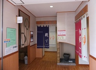 (浴室の入り口に掛かる湯のれん、左は岩盤浴)