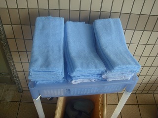 浴室に入ると右に かけ湯があって、左に 垢すり用のナイロンタオルが沢山積まれてます。