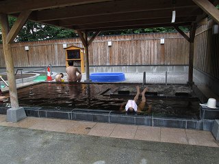露天風呂は広くて、左に渦巻状の歩行浴槽があって 右に屋根付きの四角い浴槽があります。