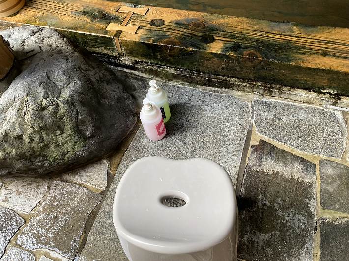 岩窟風呂には無造作にイスとソープ類が置かれているだけで決め