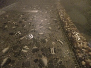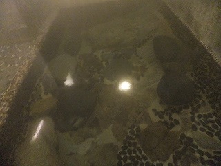 中国自動車道の院庄インターから179号線を北上して30分弱。(無料駐車場有10台) ![]() _______(奥津荘)________________(無料駐車場) 外観は歴史を感じさせる重厚感のある造りですが、館内は2004年にリニューアルしたそうです。 ![]() ________(玄関)__________________(帳場) 棟方志功ゆかりの宿と言われるだけあって、玄関周りに 沢山の棟方志功の作品があります。 ![]() ____(棟方志功の衝立)_______________(同じく掛け軸) 帳場の隣に上品なラウンジ桂(けい)があって、帳場の奥に 和風旅館らしい中庭があります。 ![]() ______(ラウンジ桂)__________________(中庭) 温泉は 帳場の奥から左下にある階段を下りた所にあって、階段の壁に案内がありました。 ※ 案内の最後に 鍵湯は男湯であると書かれてます。 (鍵湯の案内)階段を下りた所に鍵湯の入り口があって、その右奥に 貸し切りの泉の湯の入り口がありました。 ![]() _(浴室の入り口に掛かる湯のれん)__________(泉の湯の入り口) 鍵湯の脱衣所は広くないが 掃除は行き届いてます。 脱衣所にある温泉分析書によると源泉名は奥津荘鍵湯温泉で、泉質はアルカリ性単純泉です。 ![]() ____(洗面台と脱衣棚)________________(温泉分析書) 浴室の奥にある洗い場は シャワーがダイヤル式で出したり止めたりできるタイプで使いやすく 勢いも強くて、ソープ類が入ったボトルも高級感があります。 ![]() _______(洗い場)_________________(ソープ類) 温泉が底から湧き出る浴槽は 自然の岩をそのまま使った作りで、手前が浅くなっていて 奥の 深い所は 胸元位までの深さです。 ![]() ________(浴槽)_____________(左奥が深く 右手前が浅い) 底の3〜4ヶ所から温泉に伴う泡が出ていて、壁側の所から 沢山の小さい泡が常に出てます。 温泉は無色透明・無味無臭でツルスベの肌触りです。 温泉は100%の源泉掛け流しで 大量の温泉がオーバーフローになってます。 ![]() __(浴槽の底から出ている泡)___________(浴槽からあふれる温泉)