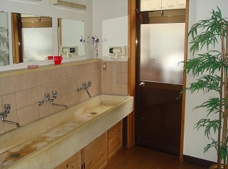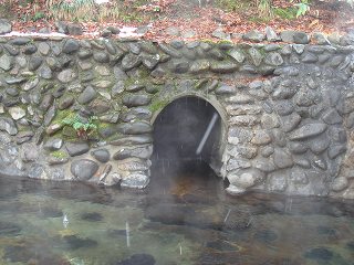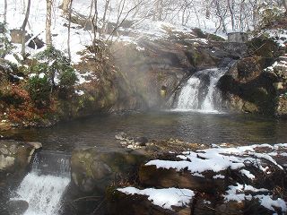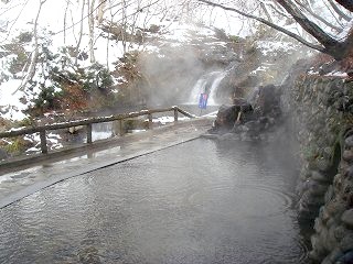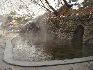 東北道の古川インターから47号線で鳴子温泉に行き、鳴子大橋の信号を右折したら 108号線 で荒雄湖に沿って走り、荒雄湖畔公園の所から間欠泉に向けて右に入るのですが、除雪の 関係か 一方通行に制限されていたので、吹上公園経由で行きました。 (峯雲閣)玄関は、白い漆喰の壁に 黒くて太い柱が使われた重厚感のある造りです。 (臼を再利用した丸いテーブル)浴室入り口の隣に昔懐かしいタイプの洗面所があって、そこに ドライヤーが1台だけあります。 ![]() _(浴室の入り口に掛かる湯のれん)_______(浴室の入り口の横にある洗面所) 清掃が行き届いた脱衣所はリニューアルされて 壁の木目がキレイです。 ![]() _______(脱衣棚)________________(簡素な洗面台) 洗い場はシンプルで ソープ類は固形石鹸だけです。 (カランの横の台に固形石鹸)内湯の浴槽は やや大きめの御影石造りで、広い窓から 露天風呂と前を流れる川が見えます。 (内湯)露天風呂は混浴で、目の前に川が流れる大きな浴槽には 石を組んだ湯口から大量の源泉が 流れ落ちています。 ![]() _____(混浴の露天風呂)____________(岩肌を流れ落ちる源泉) 無色透明の温泉はサラッとした肌触りで、温度も適温だったこともあって 雪見の温泉を長湯 しながら楽しみました。 ※ 浴槽の山側にある洞窟は 中が寝湯になってます。 ![]() _____(右手前が洞窟)______________(正面から見た洞窟) 峯雲閣の名物は 自然の川にある滝湯なのですが、この時期は冷たくて入れませんでした。 (滝壷の野天風呂)露天風呂の上にある木に積もった雪が 日が当たると溶けて落ちてくるのですが、その雪が キラキラ輝く光景は 雪国の温泉ならではのようで素晴らしかった。 (露天風呂から見上げた木の枝)