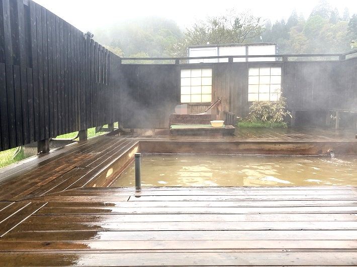 露天風呂は6人が入れる木の浴槽で 表面に 薄っすらと油のギラギラした幕が張ってました。