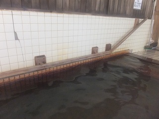 近くにある保養センターとは別の施設です。 ![]() ___(大間温泉養老センター)__________(駐車場の横にある子宝観音) 入り口は男女別になってますが、中に入ると 券売機がある所で 再び一緒になります。 ![]() _____(男性側の入り口)______________(入浴券の券売機) 券売機の前に応接セットの休憩所があって、男性側の入り口の隣に大広間があります。 ![]() __(応接セットがある休憩所)_____________(畳敷きの大広間) 浴室の入り口にあるレースのれんをくぐると 男女の浴室を見渡せる位置に番台があるので、 そこに 券売機で購入した入浴券を出します。 ![]() ________(番台)______________(レースのれんと靴箱) 脱衣所は広くて、右に 小物を置く台が付いた鏡と年代物の体重計があります。 ![]() __(小物置きが付いた大きな鏡)______________(体重計) 窓側にプラスチックの籠が入った脱衣棚があって、浴室の入り口の横に洗面台があります。 ![]() _____(脱衣棚と長椅子)________________(洗面台) 脱衣所にある温泉分析書によると 源泉名は大間温泉で、泉質は ナトリウム・カルシウム- 塩化物泉で、右下に 加水と加温はしておらず 循環ろ過と塩素消毒をしていると書かれて ました。 ※ 温泉分析書は 応接セットがある休憩所の所にもありました。 (温泉分析書)浴室に入ると 左の壁に8つの洗い場が並んでいますが、真ん中の1つは蛇口だけで、共同 浴場なので 石鹸類は置いてありません。 (洗い場)浴室の右奥にある浴槽は 縁に木が使われたタイル張りで、5人が入れる大きさです。 ![]() _____(五角形の浴槽)____________(浴槽に設置された手すり) わずかに茶色く色付いた温泉の温度は高めで 塩味と鉄の味がします。 ※ 温泉分析書には循環ろ過と塩素消毒をしていると書かれてましたが、浴槽からは温泉が オーバーフローになっていて 塩素臭も感じませんでした。 ![]() ________(湯口)______________(浴槽からあふれる温泉) (浴室の外にある林)_____ - - - - - - - - - - - - - - - - - - - - - |