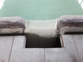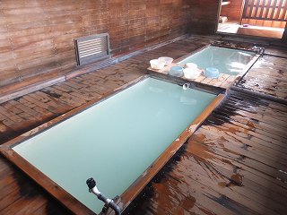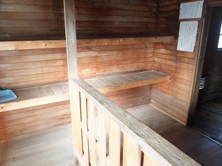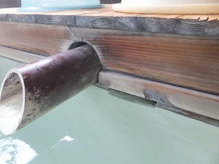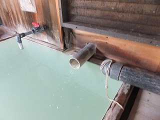 (薬師の湯) 入り口にある温泉分析書によると 源泉名は恐山12号泉(薬師の湯)で、泉質は 酸性・含硫黄 鉄(U、V)-ナトリウム- 塩化物・硫酸塩泉です。 ![]() _______(薬師の湯)_____________(薬師の湯の温泉分析書) 脱衣所は木の棚があるだけの簡素な作りです。 (脱衣所)浴室の中央に2槽に分かれた浴槽があります。 ※ 温泉は強酸性なので 建物は全て木造りです。 ![]() ____(2槽に分かれた浴槽)_____________(奥から見た浴槽) 温泉は100%の源泉かけ流しで、浴槽からあふれた温泉は 湯口の下にある穴から排出 されます。 ※ 湯口から出ている源泉の温度は高いが 浴槽の温度はぬるめでした。 ![]() ________(湯口)____________(湯口の右下に温泉を排出する穴) 適度な硫化水素の臭がする温泉を口にすると かなり酸っぱいが、肌触りは それほど刺激的 ではありません。 (浴室の天井)