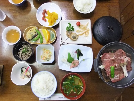 夕食は 豚肉のほうば焼き・ 刺身3点・ ごぼうの肉巻き・ 白エビの