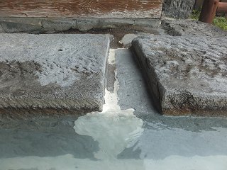 (旅行人山荘)フロントの対応は丁寧で感じが良かった。 ![]() _______(フロント)_______________(ロビーのソファー席) エレベーターで地下1階に下りると、広い休み処に 高そうな骨董品と書が展示してあります。 ![]() ____(休み処のテーブル席)_____________(高そうな骨董品と書) 男女の浴室の入り口の間に2種類の温泉成分表があります。 1つ目の温泉は 源泉名が丸尾 12、13、14、15号で 泉質が単純温泉、もう1つの温泉は 源泉名が丸尾 97号で 泉質が単純硫黄泉です。 ![]() __(浴室の入り口の間に成分表)_______________(温泉成分表) 脱衣所自体は そこそこの広さですが 中央にある脱衣棚が狭くしています。 (脱衣棚とスチール製ロッカー)洗面台とドレッシングコーナーは別々になってます。 ![]() ________(洗面台)_______________(ドレッシングコーナー) 2重の戸を開けて浴室に入ると 左に洗い場が並んでいて、右手前に 立って使うシャワーが あります。 ![]() _______(洗い場)______________(立って使うシャワーと出入り口) この時の男湯は 錦江の湯で、浴室の右奥に大浴槽と寝湯に分かれた浴槽がありました。 (内湯の浴槽)内湯は単純泉で 温泉自体は無色透明ですが、湯の花の量が多くて 青白っぽく見えます。 (大浴槽)温泉は源泉かけ流しですが、浴槽の大きさに対して 湯口から出ている源泉の量は少なくて、 わずかに硫化水素臭がする温泉を口にすると酸っぱかった。 ![]() ________(湯口)_______________(浴槽からあふれる温泉) 寝湯には湯口がなく、大浴槽からあふれた温泉が寝湯の浴槽に入るようになってます。 ※ 寝湯は普通の寝湯よりも深めで、こちらも浴槽の縁に作られた溝から温泉があふれてます。 ![]() ________(寝湯)______________(寝湯の浴槽からあふれる温泉) 露天風呂は4人が入れる石造りの浴槽で、天気が良ければ 錦江湾の奥に桜島が見える そうです。 ※ この時は景色が見えませんでしたが、目の前の庭にツツジが咲いてました。 (露天風呂)露天風呂は単純硫黄泉で、白濁の温泉からは 硫化水素臭と酸っぱい味がしました。 ※ 源泉の投入量は少なかったが 源泉の温度が高いので適温でした。 ![]() ________(湯口)________________(浴槽からあふれる温泉) 温泉から上がった後 飲泉を味わって、その後 庭園を散策しました。 ![]() ________(飲泉)____________________(庭園) 庭園にある 屋根が付いた足湯・龍石乃湯は、中央にある湯口の岩に白い結晶が付いてます。 ![]() _____(足湯・龍石乃湯)_______________(足湯の湯口の岩) 私は利用してませんが、その奥に 貸切湯の赤松の湯の入り口がありました。 立ち寄り入浴で貸し切り露天風呂を利用する場合は11:00〜14:10の間に50分1000円 (大浴場の料金込み)で、赤松の湯、もみじの湯、ひのきの湯、鹿の湯の4つの中から選ぶ ことが出来るそうです (赤松の湯の入り口)_____ - - - - - - - - - - - - - - - - - - - - - |