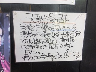 本館の前にある駐車場は宿泊者専用なので、立ち寄り入浴の客は さくらさくら温泉の奥に ある広い駐車場を利用します。 ![]() ____(入り口にある看板)_______________(さくらさくら温泉) 中に入ったら 券売機で購入した入浴券を受付に出します。 ![]() ________(券売機)___________________(受付) (受付の隣にある土産物コーナー)受付の左にある廊下を歩いて外に出たら 温泉棟の入り口で靴を脱ぎます。 (靴箱)スリッパに履き替えると、その先の廊下に面して 広い中庭があります。 ![]() _______(広い中庭)______________(中庭にある東屋とベンチ) (浴室の入り口に掛かる湯のれん)脱衣所はそこそこの広さで、左に洗面台があって 右に有料のスチール製のロッカーと脱衣籠 が入った棚があって、中央に 脱衣籠が載った金属パイプ製の棚があります。 ![]() _____(洗面ドレッシング)___________(貴重品ロッカーと脱衣ロッカー) 脱衣所にある温泉分析書によると 源泉名は さくらさくら温泉で、泉質は 単純温泉です。 (温泉分析書)浴室に入ると 左に12の洗い場が並んでいます。 ![]() _______(洗い場)______________(シャンプー・固形石鹸・リンス) 内湯の浴槽は 6人が入れる石板作りの浴槽です。 (内湯の浴槽)温泉は100%の源泉かけ流しで、温泉分析書には 泉質が単純温泉と書かれてましたが、 温泉は硫黄泉のような灰色がかった白濁でした。 ※ 温泉は硫化水素臭がするものの 酸っぱさなどの味はしませんでした。 ![]() ___(湯口、手ブレしちゃった)____________(浴槽からあふれる温泉) こちらの温泉は泥パックができることで有名なのですが、泥湯がある露天風呂は人が多くて 撮影できませんでした。 露天風呂に出ると右に水風呂があって、左に 15人が入れる岩風呂があります。 岩風呂の横に泥が入った箱があって、その泥を塗るとパックのような効果があるそうですが、 私はパックをしたことがないので その効果が分かりませんでした。 パックが終わった後は泥を洗い流さなくてはならないので、右奥に 泥を落とす為の洗い場が ありました。 ![]() _____(泥パックの案内)______________(泥パックのポスター) _____ - - - - - - - - - - - - - - - - - - - - - |