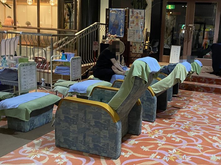 薬湯の建物の外に4つの涼み台とデッキチェアーがあります。