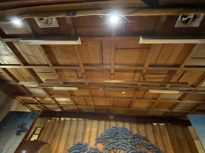 (大きな一枚板が使われた舞台の天井)