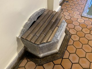 浴室の左の壁にも 竹で蓋をされた石造りの槽があって、男女の浴室を仕切る壁の上に