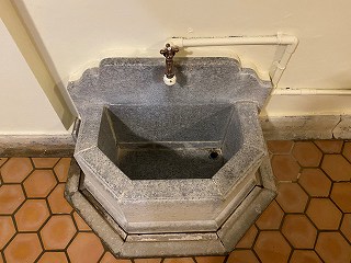 浴室の右の壁には、手前に 温泉も水も入っていない石造りの槽があって、その奥に 2つの