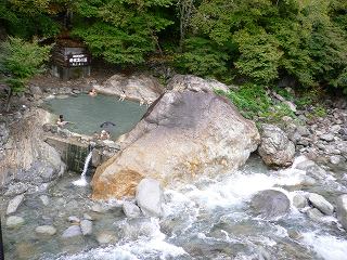 (新穂高温泉の野天風呂) 新穂高温泉の手前にあって 蒲田川に架かる橋の下にある野天風呂ですが、川沿いの浴槽は 橋から丸見えなので 女性は水着を着用して利用します。 ※ 詳しいレポはこちらです。 ![]() ____(左の小屋が脱衣所)_________(天然の岩を上手く利用しています)