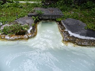 (※) 10:30〜14:00は本館内の大浴場及び混浴露天風呂、14時以降は 日帰り温泉用の __別棟外湯。 長野道の松本インターから158号線を走り、沢渡の先から 案内に従って右下に下りて、 白骨温泉公共野天風呂の所から左上に登って3分ほど走ると 右にあります。 (未舗装の駐車場)立ち寄り入浴で利用できる温泉は時間帯によって2つに分かれていて、14時までは本館の 内湯と混浴露天風呂を利用できます。 ※ 14時以降は日帰り専用の外湯(9:00〜17:00)になります。 (本館の入り口)玄関を入ると 両側の壁に靴を入れる棚があって、中央に 段ボール箱に入ったスリッパが あります。 広いロビーの正面に受付があって、その右に 貴重品ロッカーと自販機が並んでいます。 ![]() ______(玄関の靴箱)____________(貴重品ロッカーと自販機) ロビーの奥にある 泡の湯の源泉の給湯方式の説明と温泉分析書によると、源泉名は 新泡の湯源泉、泉質は 含硫黄-カルシウム・マグネシウム-炭酸水素塩温泉で、加温のみ しているとのことです。 ![]() ___(泡の湯の源泉の説明)__________(ぬる湯とあったか湯の分析書) その奥に飲泉場があって、そこから階段を登った所に 浴室の入り口があります。 飲線は 胃腸病や糖尿病に効果があるといわれて、温泉を口にすると 強い硫化水素臭が しましたが、一般的な白濁の温泉のような 強烈な酸っぱさではありませんでした。 ![]() _______(飲泉場)____________(浴室の入り口に掛かる湯のれん) 脱衣所は 左に洗面台があって、右に 脱衣籠が並んでいます。 ![]() ____(洗面ドレッシング)_______________(脱衣籠) 浴室は木造りで 右が洗い場のコーナーになっていますが、カランは 水と湯を別々に調整 しなくてはならないうえに勢いが良すぎて使いにくかった。 (洗い場)内湯の手前が 滑り止めの溝がある板の間になっていて、窓側に あつ湯(40度)と ぬる湯 (37度)の浴槽があります。 ここの源泉を そのまま使っている透明な ぬる湯が 泡の湯の由来で、空気に触れる時間が 少ない新鮮な源泉は白濁してなくて、湯口では 温泉に含まれる炭酸の泡が出ています。 ![]() ____(あつ湯と ぬる湯)__________(ぬる湯の湯口、手ブレしちゃった) 源泉を熱交換器で加温したという あつ湯は、空気に触れる時間が長いので白濁しています。 温泉は どちらも掛け流しで、浴槽からあふれた温泉はオーバーフローになっています。 ![]() _____(あつ湯の湯口)_____________(浴槽から あふれる温泉) 内湯の外にある小さな露天風呂は 加温した温泉が掛け流しになっていて温度は高めですが、 この露天風呂は三方を囲まれているために 開放感がなかった。 (露天風呂)小さな露天風呂から長い連絡通路を歩いた先に 混浴の大露天風呂があります。 男性は この連絡通路を歩いて大露天風呂まで行けますが、女性は 一度服を着てから 移動しなくてはならないようです。 ![]() _______(連絡通路)___________(露天風呂の出口にある階段) 大露天風呂には 3本の樋から源泉が豪快に流れ落ちています。 ※ 女性は湯浴用のバスタオルが用意されているそうで、この時は1組のカップルがいました。 ![]() __(混浴大露天風呂の三本湯滝)_________(奥から見た大露天風呂) 三本湯滝とは別に 加温された源泉が出ているパイプがあって、浴槽からあふれた温泉は 排水口に流れ込んでいます。 この温泉は神経痛・冷え症などに効果があって、身体の芯から温まる温泉に3日入れば 3年は風邪をひかないといわれます。 ![]() _(加温された源泉が出ているパイプ)________(排湯口に流れ込む温泉) (湯上り) 用意されていた山の自然水を飲んでから ロビーにあるソファーでくつろぎました。 ![]() ______(山の自然水)______________(ロビーの休憩所) _____ - - - - - - - - - - - - - - - - - - - - |