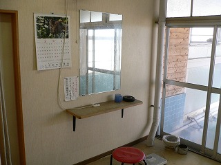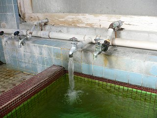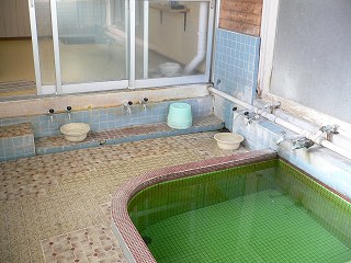 浴室に入ると、手前に 水と湯が別になったカランと洗面器がありますが、共同浴場なので