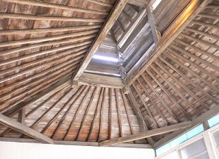 浴室の壁は かなり老朽化が進んでますが、蛇の目傘のような作りの天井は 葺き替えたのか