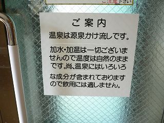 洗面台には「水 飲めます、温泉 飲めません」の表示があって、浴室の戸に温泉の案内が