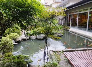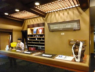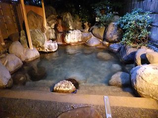 ![]() (玉造温泉の入り口にあるモニュメント)___________(紺屋) こちらの宿は縁結びの宿ということで、玄関前に 縁結びの御足湯があります。 (縁結びの御足湯)エントランスを入ると大きな活け花があって、その左にフロントがあります。 ![]() ___(ロビーにある活け花)_______________(フロント) 宿は 出雲神々縁結びの宿ということで、フロントの前に 縁結びの赤い紐を結わえた竹と 毎年出雲大社に奉納されるという 稲わら細工の鶴と亀がありました。 ![]() _(縁結びの赤い紐を結わえた竹)__________(稲わら細工の鶴と亀) 宿の宿泊者は浴衣を選べるようで、ロビーに サイズごとに並べられた浴衣がありました。 (宿泊者用の浴衣)ロビーから縁(えにし)の湯と書かれた廊下を歩いて行くと、右に 鯉が泳ぐ池があります。 ![]() ___(縁の湯と書かれた廊下)_____________(中庭にある池) その奥に 男女の浴室の入り口があるのですが、この時は 女性用の入口が2つありました。 (浴室の入り口に掛かる湯のれん)浴室に入り口にある温泉の成分表によると 源泉名は玉造温泉、泉質は アルカリ性単純温泉 で、加水・加温・循環ろ過・塩素系薬剤を使用しているとのことです。 (温泉の成分表)脱衣所の棚には籐の籠が並び、洗面台のアメニティーも充実しています。 ![]() _______(脱衣棚)_______________(洗面ドレッシング) 浴室の右に コの字形に並ぶ洗い場があって、その内の2ヶ所には馬油のソープがありました。 (洗い場)浴室の左にあるタイル張りの浴槽は 湯口から出ている温泉の量は多かったが、浴槽から あふれている量は それほどでもなかった。 温泉は無色透明・無味無臭で 浴槽の中で指をこするとキュッキュと音がしました。 ![]() ______(内湯の浴槽)_______________(内湯の湯口) 露天風呂に出ると 右に竹製の涼み台のような物があって、左奥に 岩を組んだ浴槽があり ますが、浴槽は かなり深めで、入り口に 3段になった石段があって、浴槽の中に置いてある 岩に座った状態で ちょうど良い深さでした。 浴槽の奥にある石組みの湯口から大量の温泉が流れ落ちてますが、浴槽の手前にある 排水溝に流れ込んでいる温泉の量は少なかった。 ![]() ______(露天岩風呂)______________(露天風呂の湯口) 露天風呂は周囲を壁に囲まれて、上に 角材の梁が渡されているので開放感はありません。 (露天風呂の上)入浴中は それほどの塩味を感じませんでしたが、湯から上った後 しばらく口の周りが塩っぱ かった。 (湯上り) 浴室の入り口にある冷水を飲んでから、ロビーで 中庭を眺められるイスに座って寛ぎました。 ![]() ____(美味しかった冷水)_______________(ロビー) 大きいホテルなので 土産コーナーの品揃えも充実しています。 (お土産コーナー)_____ |