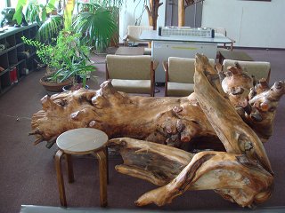 ロビーに雰囲気の良い木工品があります。