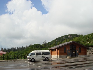 (十勝岳登山口の駐車場、奥はトイレ)__________(湯元 凌雲閣)