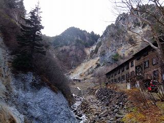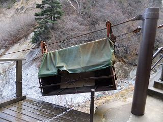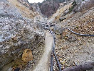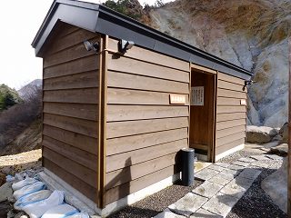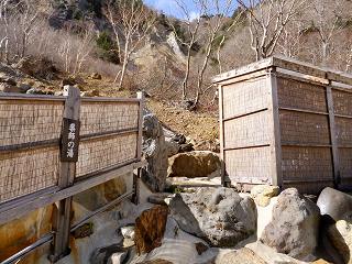 東北道の飯坂インターから国道13号線を走り、板屋の町を通り抜けて山道を14km。(約70分) 駐車場は無料で40台。____________________(パンフレットを参照) 板谷駅からの林道は舗装されているが狭くて、滑川温泉の分岐を過ぎると さらに狭くなって かなりきつい傾斜に急カーブが連続する道になります。(切り返しを要するカーブが1ヶ所あり) ![]() ___(板屋駅から先の林道)______________(無料駐車場) 升形屋旅館は 駐車場の奥にある長い吊り橋を渡ってから坂道を100メートルほど登った所に あります。 ![]() ___(駐車場から見た升形屋)_______________(吊り橋) 吊り橋の下を流れる川の水は青白く濁っていて 橋を渡ると硫化水素の臭いがしてきます。 ![]() ______(升形旅館)___________(架線で旅館の荷物を運搬するカゴ) 姥湯温泉は立ち寄り入浴で利用する客も多いようで、旅館の入り口の右に 立ち寄り入浴客 専用の受付窓口があります。 ![]() (旅館の入り口、右が立ち寄り入浴の受付)________(旅館の受付) 玄関を入ると日本秘湯を守る会の提灯があって、ロビーの天井に七福神の顔があります。 ![]() __(日本秘湯を守る会の提灯)_______________(ロビー) 立ち寄り入浴で利用できる温泉は露天風呂だけです。 旅館と川の間にある道を登って行くと 右上に宿泊者専用の内風呂があって、その上に 女性 専用の露天風呂・瑠璃の湯があります。 ![]() ___(宿泊者専用の内風呂)____________(女性専用の露天風呂) その先で 鉄パイプの手すりが付いた橋を渡った奥に 混浴の露天風呂があります。 (混浴露天風呂の前にある橋)露天風呂には 山姥の湯と薬師の湯の2つがあって、山姥の湯の前に脱衣所があります。 脱衣所の中に 源泉名が姥湯源泉温泉と書かれた温泉分析書があって、温泉の利用表示は 見当たりませんでしたが、ロケーションから100%の源泉掛け流しで間違いないと思います。 ![]() ___(脱衣所、奥が女性用)_______________(温泉分析書) 脱衣所の上にある山姥の湯は 渓谷の奥から湧出した源泉をそのまま投入しています。 温泉は15人ぐらいが入れる岩風呂で 温度は やや高目です。 (山姥の湯)白濁の温泉は強い硫化水素臭がして レモネードより酸っぱかった。 ![]() __(掛け湯の手桶、奥に排湯口)_____(奥の白い所が硫黄成分で白くなった湯口) 山姥の湯から少し戻った所の上に 薬師の湯があります。 脱衣所は、棚にプラスッチックの籠が載っているだけの作りで男女の区別もなく、目隠しの ヨシズに 山姥の湯の脱衣所と同じ温泉分析書が貼られてました。 ![]() ____(薬師の湯の入り口)_____________(薬師の湯の脱衣所) こちらは山姥の湯の半分ぐらいの大きさの岩風呂で 温度は適温ですが、浴槽の入り口の 所が急に深くなっているので 入る時は要注意です。 ![]() ______(薬師の湯)_________________(排湯口) 姥湯温泉はワイルドなロケーションにあって、硫黄の影響を受けたと思われる渓谷の斜面は 草木が生えることなく 岩肌がむき出しになってます。 ![]() (立ち入り禁止だった 源泉口に行く道)________(赤茶けた渓谷の壁面) (姥湯温泉の由来) ※ オフィシャルサイトを参照。 鉱山師だった初代が鉱脈を求めて山々を渡り歩いて たまたまこの地にやって来たら、露天 風呂に髪の長い女性が湯浴みしているではないか! こんな山奥で女が湯浴みとは、驚きながら おそるおそる近づいてみると 赤ん坊を抱いた 恐ろしい形相の山姥であった。 思わず逃げ腰になると「そんな因果な山師などやめて この湯の湯守にならんかい」と云い 残して、赤ん坊もろとも 山姥の姿はどこかえ消えてしまったという。 それ以来 この湯を姥湯と名づけて 現在に至ると伝えられております。