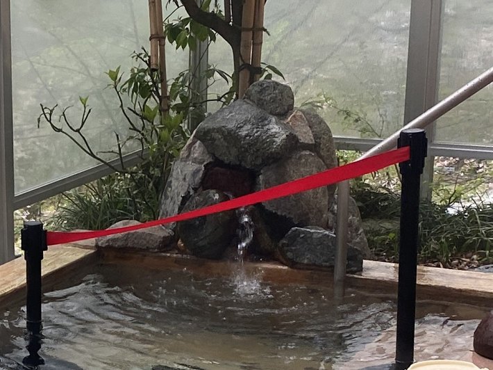 ____(やけど防止のテープが付いた露天風呂の湯口)