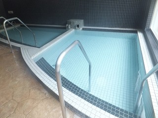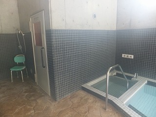 浴室の左にサウナと水風呂があって、その隣に 3人が入れる40℃の浴槽と5人が入れる