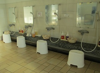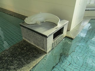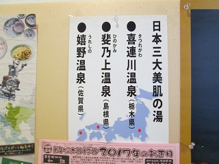 (シーボルトの湯)玄関を入ると 嬉野温泉のゆるキャラ「ゆっつらくん」が出迎えてくれます。 ![]() _____(ゆっつらくん)____________(100円リターン式の靴箱) 券売機は最新のタッチパネルで、そこで購入した入浴券を受付に出します。 ![]() _______(券売機)__________________(受付) 受付前のロビーに 日本三大美肌(美人ではない)の湯の案内があって、1階に3つ、2階に2つの 個室の浴室があります。 ![]() (ロビー、奥にある戸が貸切り湯の入り口)_________(日本三大美肌の湯) 受付から右に行った廊下の奥に浴室の入り口があります。 (浴室の入り口に掛かる湯のれん)脱衣所はそれほど広くないが 清掃は行き届いています。 ![]() _(100円リターン式の脱衣ロッカー)_________(洗面ドレッシング) ロビーと脱衣所にある温泉分析書によると 源泉名は嬉野温泉 清流源泉で、泉質はナトリウム -炭酸水素塩・塩化物泉です。 (温泉分析書)浴室に入ると 左に5つ 右に6つの洗い場があって、シャンプーはリンスインタイプで シャワー の勢いが かなり強い。 (洗い場)浴室は白を基調にした明るいつくりで 窓側に2つに分かれた浴槽があります。 左が8人が入れる大きさで、右が3人が入れる大きさですが、それぞれの浴槽に温度などの 違いは感じられません。 (左側の浴槽)湯口から出ている温泉の量は少ないが 浴槽からオーバーフローになっています 。 温泉は無色透明・無味無臭にヌルスベの肌触りで わずかにカルキ臭がしました。 ![]() ___(ナマズが載った湯口)___________(浴槽からあふれる温泉) (右側の浴槽)(2階の休憩所) 2階の休憩所は有料(100円)ですが 温泉を利用した人は無料で利用できます。 ![]() (壁にある 龍馬とお慶の人生行路表)________(左側にあるテーブル席) ![]() ___(右奥にあるテーブル席)___________(右の窓側にある大広間) 休憩所に セルフで飲めるお茶がありました。 (給茶のセット)