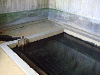 温泉の温度調節は変わっていて、排湯口の板を開けたり閉めたりすることで調整します。