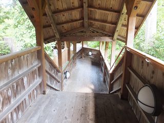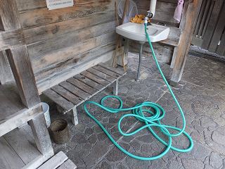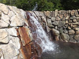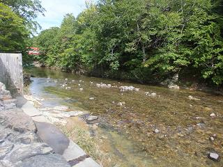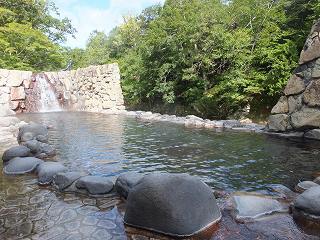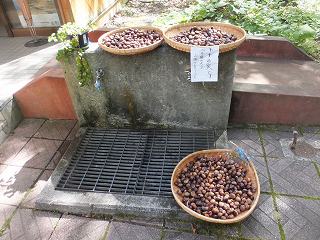 ![]() __(奥薬研温泉レストハウス)_________(河童の湯の由来とカッパの噴水) 庭先に大きな足湯の施設があります。 (足湯)仲は、左が格子に囲まれた足湯で 正面に岩風呂風の足湯があって、右が 歩行浴のような 手すりが付いた足湯になっています。 ![]() ____(格子の中の足湯)____________(右が 手すりが付いた足湯) 入り口に 持ち帰りできるトチの実が干してあって、玄関を入った所に熊の剥製がありました。 ![]() ______(トチの実)_________________(熊の剥製) 中に入ったら 券売機で購入した入浴券をレジの所にある箱に入れます。 ![]() _______(券売機)_____________(レジにある入浴券入の箱) レジの前に土産物が並んでいて 左奥が食堂になっています。 ※ 食堂の画像がピンぼけになってしまいました。<m(__)m> ![]() _(地産の物が並ぶ土産物コーナー)_____________(食堂) ここにある温泉分析書によると 源泉名は赤滝1号泉、泉質は単純温泉で、温泉の利用案内 によると 源泉温度が63.5℃なので温度調節に水道水を使い、源泉とタンクに保存して滅菌 した湯を混合して使用しているとのことです。 ![]() ______(温泉分析書)______________(温泉の利用案内) 内湯の有無はわかりませんが 立ち寄り入浴で利用できるのは露天風呂だけです。 レジの奥にあるドアを開けて外に出て長い階段を下りた所に浴室の入り口があります。 ![]() _____(温泉に行く階段)___________(温泉の入り口、奥が女湯) 脱衣所は ホースが付いた蛇口と脱衣棚があるだけの簡素な作りで、シャンプー・石鹸類の 使用が禁止されているので洗い場はありません。 ![]() _______(脱衣所)____________(温泉の温度調節用のホース) 浴槽は20人以上が入れる大きさで、左右に 高い石組みの壁があります。 ![]() ____(手前から見た浴槽)_____________(奥から見た浴槽) レジの所に 男湯44℃、女湯43℃と書かれていましたが、晴天の下で入る44℃の温泉は 熱くて、肩まで浸かると しばらく我慢できましたが、浴槽から上がると体が赤くなってました。 温泉は無色透明・無味無臭にキュッキュとした肌触りで、浴槽からオーバーフローになって います。 ![]() (滝のように流れ落ちる源泉、上に河童の像)____(浴槽からあふれ出る温泉) 浴槽の前を大畑川が流れています。 ![]() ____(浴槽から見た大畑川)__________(来る途中に撮影した大畑川)