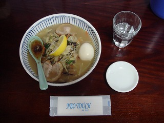 上に2枚のチャーシューと ゆで玉子レモンがのっています。