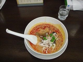 スープは見た目ほど辛くなく、中央に乗ったエビはカリッとした歯ごたえで、ゴマの風味と