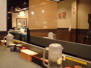 席はカウンター席のみで、手前に コの字型のカウンター席があり、厨房の横に 短い