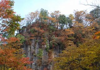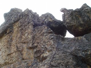 その先で左上を見上げると、角ばった岩の元である柱状摂理の絶壁が見えました。