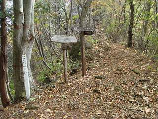 登山口から杉林の中を20分登って稜線に出ると、ヒノキ林と雑木林の境目に赤岩の分岐が
