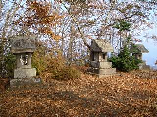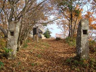 山頂は 2本の門柱の奥に広場があって、そこに 3つの石の祠が並んでいます。