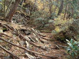 中腹コースの分岐から登山道が一変して 木の根が出た急斜面の道を登りますが、ここの