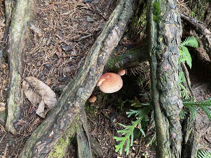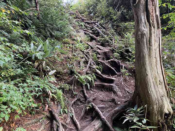 登山道に檜の巨木が多くなると木の根が出た登山道になって、段差の大きい所では 根に
